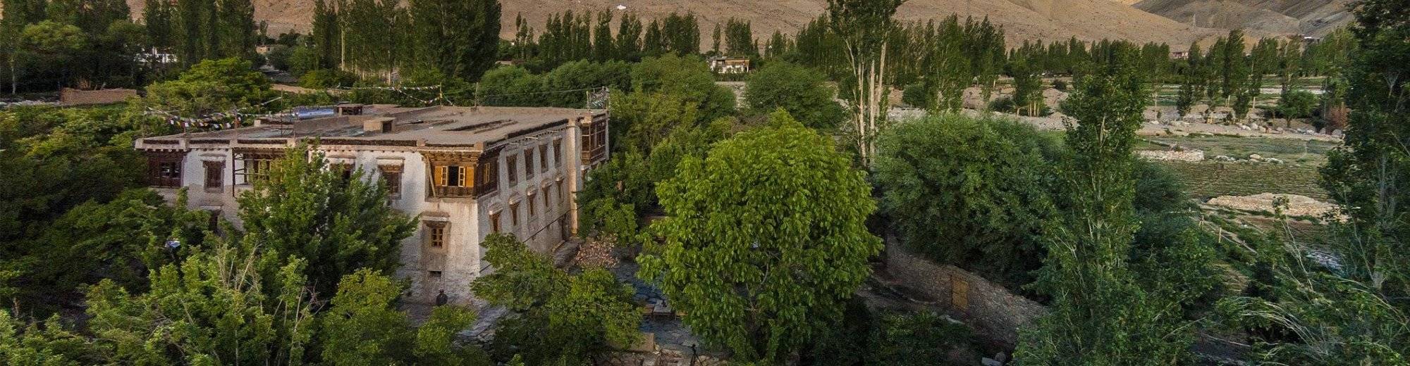 Construite au XXème siècle pour le cousin du roi du Ladakh, Nimmu House est une maison noble perchée à 3100m d’altitude dans un cadre verdoyant entourés de sublimes panoramas himalayens. Reconvertie en 2012 en boutique hôtel de charme, la maison accueille aujourd’hui les voyageurs dans 4 chambres traditionnelles au premier étage et 7 tentes de luxe éparpillées dans le verger à l’ombre des arbres fruitiers. La propriété a conservé ses temples bouddhistes et son étable d’origine, dans laquelle yaks et dzos se reposent paisiblement. Ce cadre intime et convivial a pu conserver tout son cachet et son authenticité, en étant rénové dans le respect des traditions ladakhies.